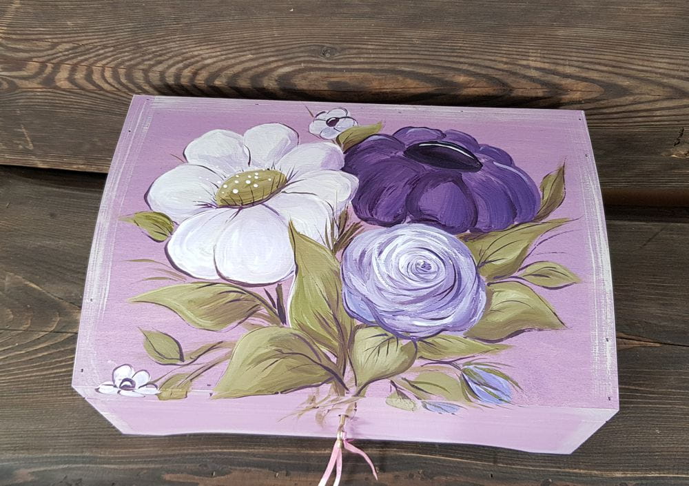 Jest ręcznie malowany autorskim wzorem wariacja fioletowa.